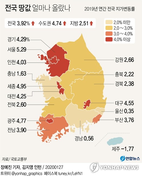 (세종=연합뉴스) 윤종석 기자 = 작년 땅값이 전년 대비 3.92% 증가하는 데 그쳤다.