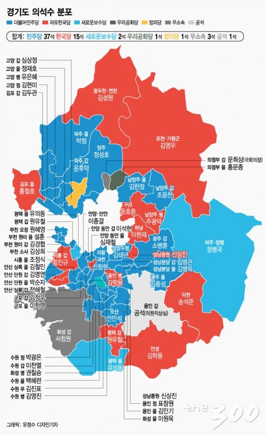 ◇역대 성적표는 = 2016년 20대 총선에선 ‘파란 깃발’이 우세하다. 현재 총 60석 중 △더불어민주당 37석 △자유한국당 15석 △새로운보수 2석 △우리공화당 1석 △정의당 1석 △무소속 3석(문희상·이언주·서청원) △공석 1(의원직상실)이다. 다만 표차는 아슬아슬했다. 중앙선거관리위원회에 따르면 고양을(900표차), 남양주갑(249표차), 군포갑(726표차)등이 1000표 이하로 당선이 갈렸다. 18대 총선에선 당시 선거판을 휩쓴 한나라당 발 ‘뉴타운 바람’에 따라 △한나라당 32석 △친박연대 1석 △통합민주당 17석 △무소속 1석 결과가 나왔다.