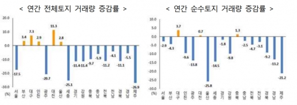 시도별로는 전년 대비 전체토지 거래량은 대전(11.3%), 대구(7.3%), 부산(3.4%), 인천(2.9%), 울산(2.8%)에서는 증가했다. 나머지 12개 시도에서 감소했다. 순수토지 거래량은 전년 대비 대구(3.7%), 충북(1.3%), 대전(0.7%)은 증가했다. 울산(-25.8%), 제주(-21.2%), 세종(-14.5%), 광주(-13.8%) 등은 감소했다.