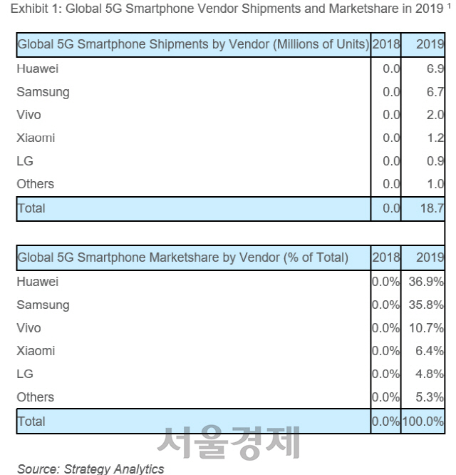 29일 시장조사업체 스트래티지 애널리틱스(SA)에 따르면 화웨이는 지난해 690만대의 5G폰을 출하해 36.9% 점유율을 기록했다. 뒤를 이어 삼성전자는 점유율 35.8%(670만대)를 차지한 것으로 집계됐다. 양사의 점유율 격차는 1.1%포인트에 불과해 치열한 경쟁을 벌이고 있는 것으로 나타났다.