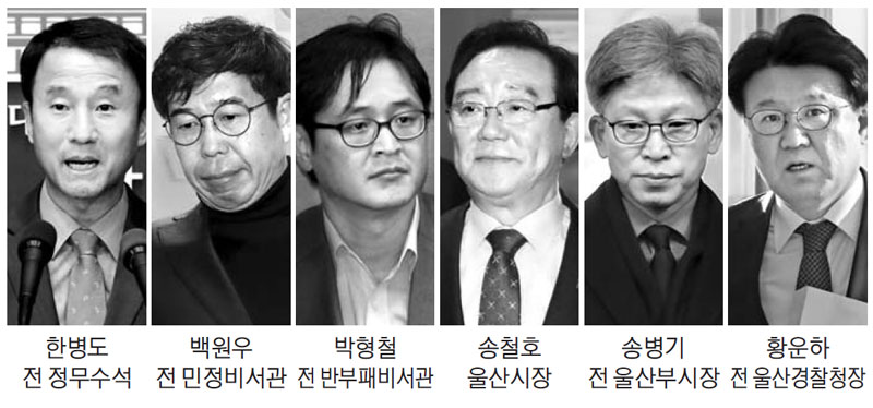 29일 검찰이 한병도 전 대통령 정무수석, 백원우 전 민정비서관, 박형철 전 반부패비서관, 송철호 울산시장 등을 기소하면서 전직 청와대 인사들과 여권 정치인들이 대거 법정에 서게 됐다. 이성윤 서울중앙지검장은 이날 기소 여부 결정 회의에서 윤석열 검찰총장과 수사팀의 기소 방침에도 유일하게 반대 의견을 낸 것으로 알려졌다.