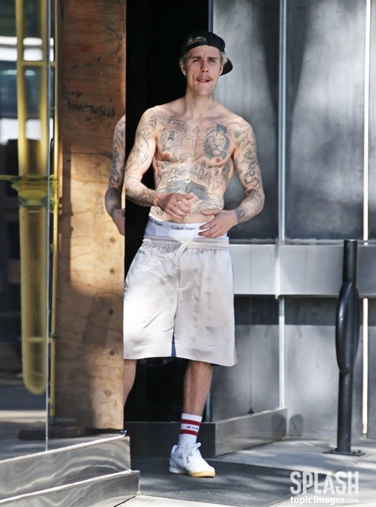 공개된 사진 속에는 저스틴 비버가 상의를 탈의한 후 이동 중인 모습이 담겨 있다. 몸을 가린듯한 화려한 문신이 눈길을 끈다.