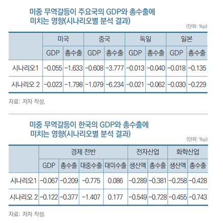 시나리오2에서는 한국 경제가 더 큰 영향을 받는다. GDP는 0.1222%P, 수출은 0.377%P가 줄어든다. 주요 산업 중 전자산업 수출은 0.728%P, 화학산업 수출은 0.743%P가 각각 감소하는 것으로 분석됐다.