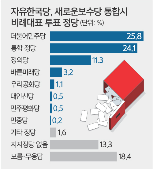 세계일보가 창간 31주년을 맞아 여론조사기관 ‘리서치앤리서치’에 의뢰해 지난 26일부터 28일까지 사흘간 전국 만 18세 이상 성인남녀 1007명을 대상으로 여론조사를 실시한 결과 ‘이번 총선에서 지역구 후보자 한 표 외에 정당에 주는 한 표, 즉 비례대표 투표는 어느 정당에 하겠느냐’는 질문에 보수 통합신당을 선택한 응답은 24.1%로 나타났다. 민주당 비례대표에 투표하겠다고 밝힌 응답은 25.8%였다. 두 응답의 격차는 오차범위 내(±3.1%포인트)인 1.7%포인트에 불과했다.