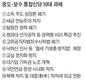 혁신통합추진위원회(통추위)는 31일 1차 대국민 보고대회를 열고 '범(汎)중도·보수 통합 신당' 창당준비위원회를 1일 발족시키기로 했다. 또 이달 20일 전후로 통합신당을 창당하기로 했다. 통추위는 이날 신당의 정강·정책에 반영될 '5대 정책 기조' '문재인 정권 바로잡기 10대 과제'도 제시했다. 자유한국당 황교안 대표와 새로운보수당 유승민 보수재건위원장 간의 '당 대 당 통합' 논의도 무르익고 있다. 두 사람은 이르면 2월 4일 만나 통합 논의를 할 것으로 알려졌다.
