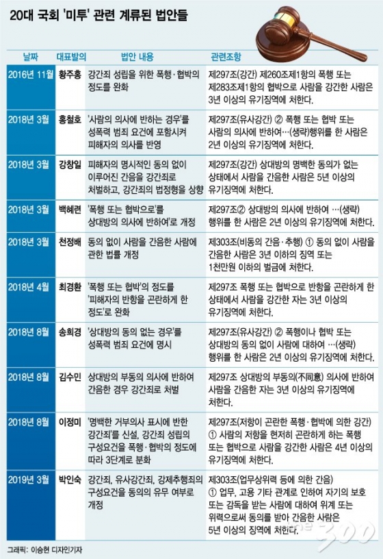 물론 '업무상 위계·위력 등에 의한 간음죄'의 징역형 상한을 최대 5년에서 7년으로 높이고 추행죄의 경우 최대 2년에서 3년으로 조정하는 등의 성과도 있었다. 그러나 아직도 '법안 무덤'에서 벗어나지 못한 미투 입법 과제들이 남아있다.