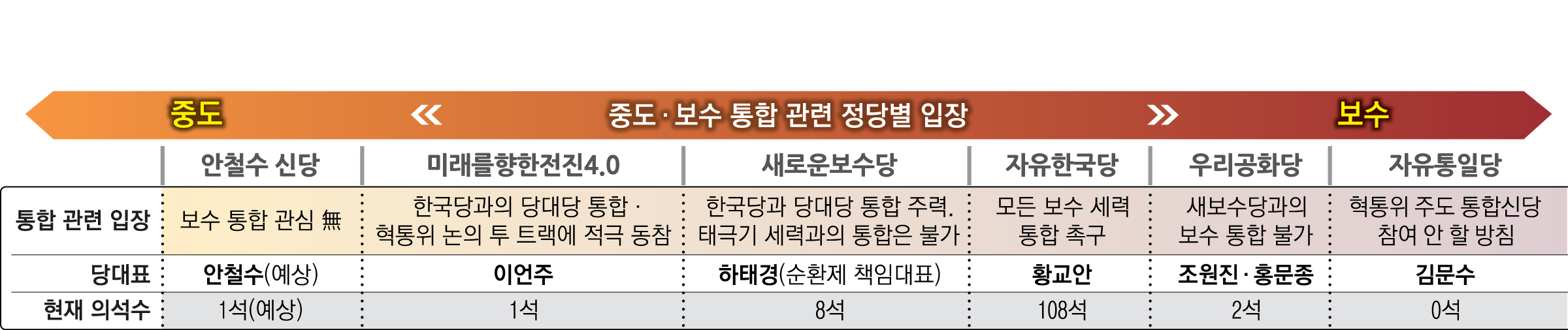 한국당은 ‘반문재인 연합’을 기치로 들고 중도에서 극우까지 모든 세력에 러브콜을 보내고 있다. 심재철 한국당 원내대표는 지난달 31일 열린 원내대책회의에서 “안철수씨도, 김문수 전 경기지사도 통합에 합류해야 한다. 안철수 현상은 이미 사라진 지 오래”라며 회유와 압박을 병행했다. 한국당은 보수통합이 이뤄져야 지역구 선거 등의 승산을 최대한 높일 수 있다.