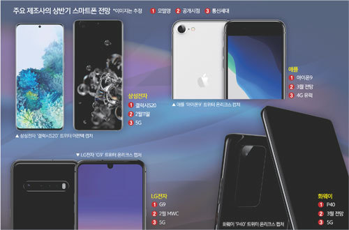 그동안 주로 가을에 신제품을 공개해 온 애플도 오는 3월 ‘아이폰9’(가칭) 또는 ‘아이폰SE’로 불리는 신제품을 공개하는 것이 유력하다. 아이폰8의 디자인을 계승한 신제품은 4.7인치 LCD(액정표시장치) 디스플레이를 장착하고 LTE를 지원하는 보급형 모델일 것으로 전망된다. 애플은 하반기 공개할 것으로 예상되는 아이폰11 시리즈의 후속작에 첫 5G폰을 내놓을 것이란 관측이 우세하다.
