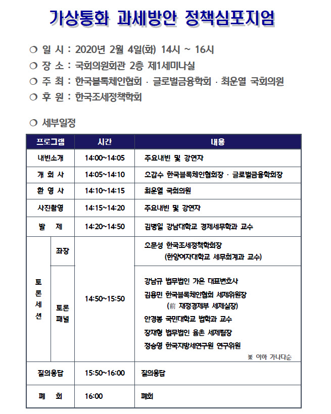 오갑수 회장과 최운열 의원의 개회사 및 환영사에 이어 김병일 강남대학교 경제세무학과 교수가 가상통화의 과세기준 정립과 구체적 과세방안을 주제로 발표할 예정이다.