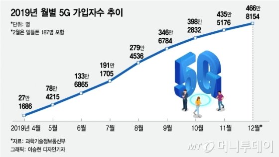 지난해 4월 5G 상용화 이후 5월부터 7월까지 매달 50만명씩 늘어난 5G 가입자는 8월과 9월 90만명, 70만명에 육박하는 등 정점을 찍었다. 이후 통신사들이 최대 70만원대까지 지원한 공시지원금을 줄이면서 4분기엔 월별 30만~50만명으로 증가세가 꺾였다. 지난해 5G 전체 가입자 수도 500만명에 못 미친 466만명에 그쳤다.
