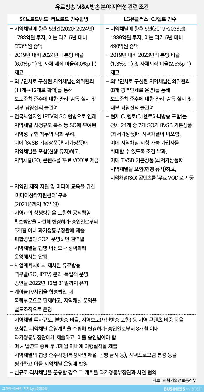 티브로드가 운영하던 권역별 지역채널을 합병 이전보다 광역화해 운영해서는 안 된다는 조건도 붙었다. SK브로드밴드가 사업계획서에서 제시한 유료방송 역무별(SO, IPTV) 분리·독립적 운영 방안도 오는 2022년까지 유지해야 한다.