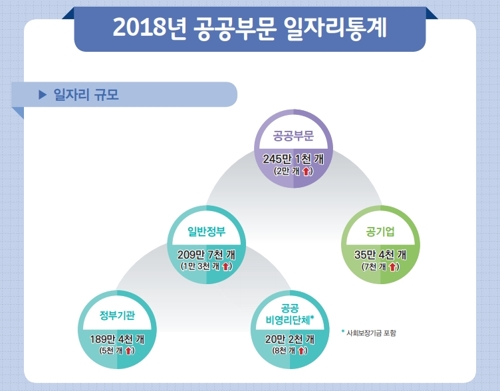 일반정부(209만7천개)는 전년보다 1만3천개(0.6%) 늘었고, 공기업(35만4천개)은 7천개(2.1%) 증가했다.