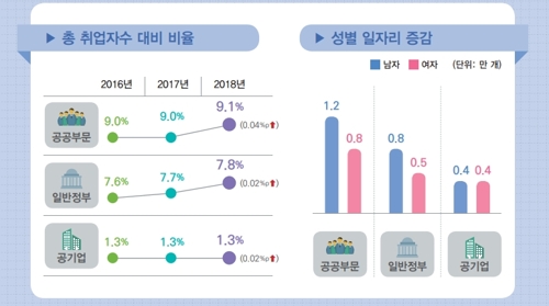 (세종=연합뉴스) 이 율 기자 = 2018년 기준 공공부문 일자리가 전년보다 2만개 늘면서 전체 취업자의 9.1%를 차지했다.