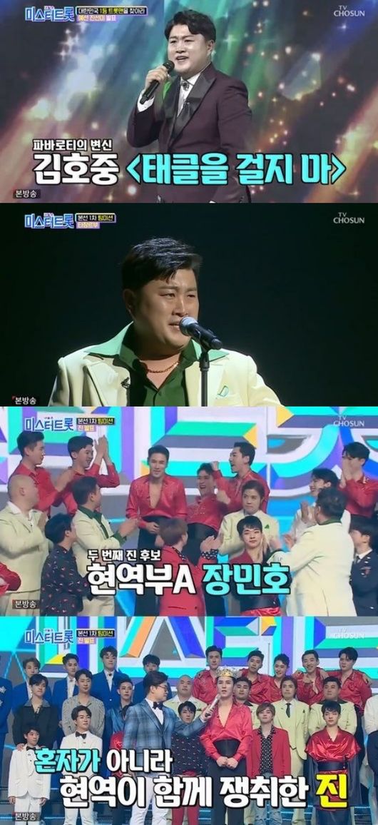 특히 '미스터트롯' 6회에서는 김호중과 장민호의 1대 1 데스매치가 성사돼 '미리 보는 결승전'을 짐작케 했다. 역대 진들의 대결이라는 긴장감 속에 장민호는 '님'을 선곡해 한복 의상까지 갖추 입고 국악의 느낌을 십분 살렸다. 승리는 김호중이 차지했으나 장민호는 현장 관객들의 압도적인 지지 속에 관객 투표 1위를 차지하며 다음 라운드까지 안착했다.