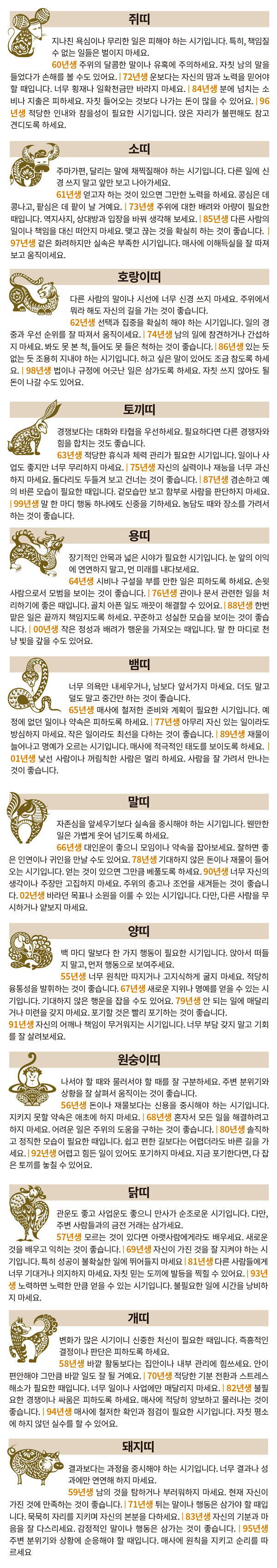 02년생 - 바라던 목표나 소원을 이룰 수 있는 시기입니다. 다만, 다른 사람을 무시하거나 얕보지 마세요.