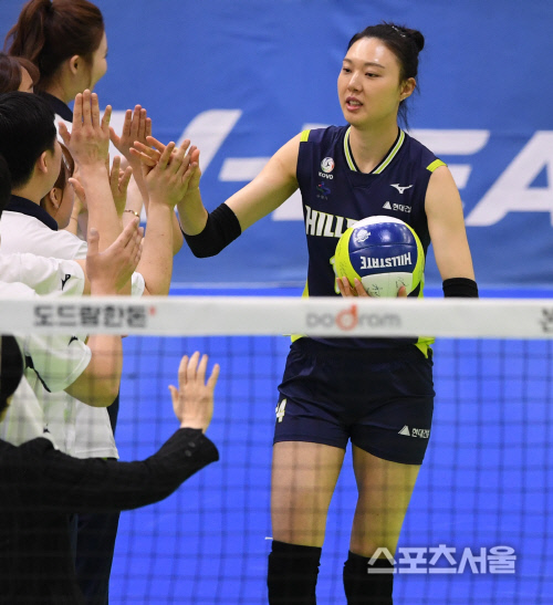 현대건설 양효진이 11일 경기도 수원실내체육관에서 진행된 도로공사와의 경기에서 코트에 들어서며 코칭 스태프와 하이파이브를 하고있다. 2020.02.11. 수원 | 김도훈기자 dica@sportsseoul.com