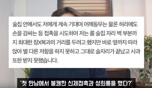 이 기자는 이 같은 폭로 글에 대해 “범죄가 성립되는 사안이 없어 보인다”며 “첫째 ‘첫만남에서 불쾌한 신체접촉과 성희롱을 했다’는 주장은 사실 그 당시 문제 삼았으면 충분히 문제가 될 수 있었다”고 지적했다.