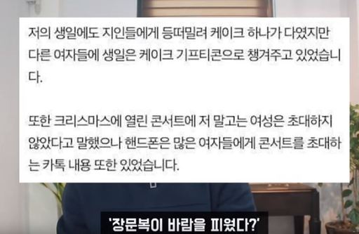 더불어 “다섯번째 ‘장문복이 바람을 피웠다’고 하는데, 연인 간 바람을 피웠다면 지탄을 받을만하지만 A씨 주장에 따르면 장문복이 바람을 피웠다고 보기에는 근거가 부족하다”며 ”전 ‘썸녀’에게 카톡을 보냈다고 하는데 어떤 내용인지 밝히지 않았다”고 했다.