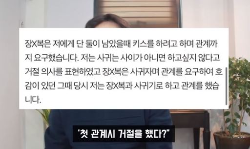 이 글을 올린 A씨는 장문복과 석달 넘게 만났는데, 첫 만남 당시 성추행을 당했다는 취지로 폭로했다. 이후 성관계를 요구받아 사귀기로 하고 합의로 맺었고, 사귀는 도중 장문복이 계속 무리한 성관계를 요구했다고 밝혔다.