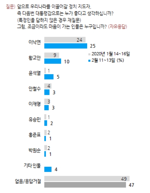 여론조사기관 한국갤럽이 지난 11~13일이 2월 둘째주 차기 정치 지도자 선호도 조사를 진행한 결과, 윤석열 총장이 5% 지지도를 얻었다.