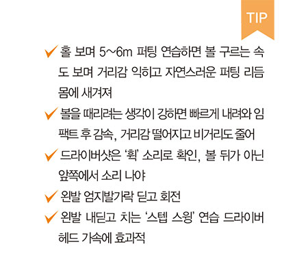 스텝 스윙을 하며 체중 이동을 정확하게 하고 ‘휙~’ 소리가 폴로스루 구간에서 나올 수 있게 연습을 해보세요. 확 늘어난 정교한 장타에 놀랄 수 있습니다.