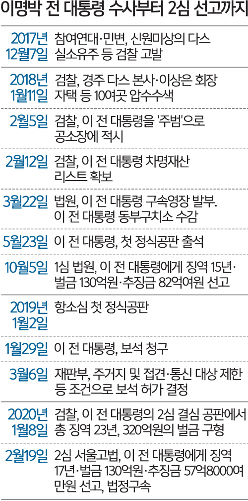 증인 내세운 재판전략도 ‘패착’… 항소심 형량 1심보다 2년 늘어/ 다스 횡령액 5억 증가 252억원/ 특활비도 국고손실 유죄 유지/ 추징금은 25억 줄어 57억여원/ 1심 증인 거부했다 무더기 요청/ 이학수 등 법정서 “MB측 돈 요구”/ ‘다스 소송비 대납’ 되레 뒷받침