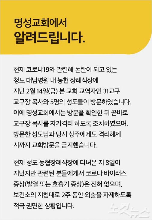 서울 명성교회는 "지난 14일 31교구 교구장 목사와 5명의 교인들이 청도 대남병원 내 농협장례식장에 다녀왔다"면서, 이를 확인한 뒤 교구장 목사의 자가격리를 조치했다고 밝혔다. 또 "교인들과 당시 상주들도 격리해제시까지 교회 방문을 금지했다"고 밝혔다.