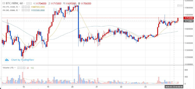 24일 오전 8시 30분 빗썸 기준 국내 비트코인(BTC) 가격은 전날 같은 시간보다 0.42% 오른 1,175만 원이다. 이더리움(ETH)은 0.53% 상승한 32만 3,400원, 리플(XRP)은 0.12% 떨어진 334.1원이다. 비트코인캐시(BCH)는 0.36% 오른 47만 1,000원, 비트코인에스브이(BSV)는 0.34% 상승한 34만 7,600원에 거래되고 있다.