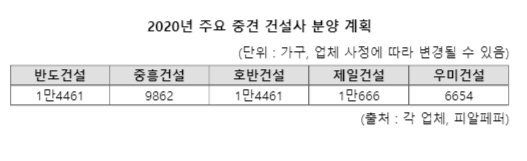 25일 건설업계에 따르면 반도·중흥·호반·우미·제일 등 5개 건설사는 올해 약 4만9000가구를 분양할 계획이다. 도시정비사업이 주축인 서울 도심 공급보다는 신도시와 광역시를 중심으로 주택을 공급할 예정이다. 이 때문에 수도권(강남3구·수도권 규제지역 등) 공급은 약 5200여 가구에 그쳤다. 건설사별로 보면 반도건설이 7347가구를, 중흥건설은 9862만가구, 호반건설 1만4461가구, 제일건설 1만666가구, 우미건설이 6654가구를 분양한다.