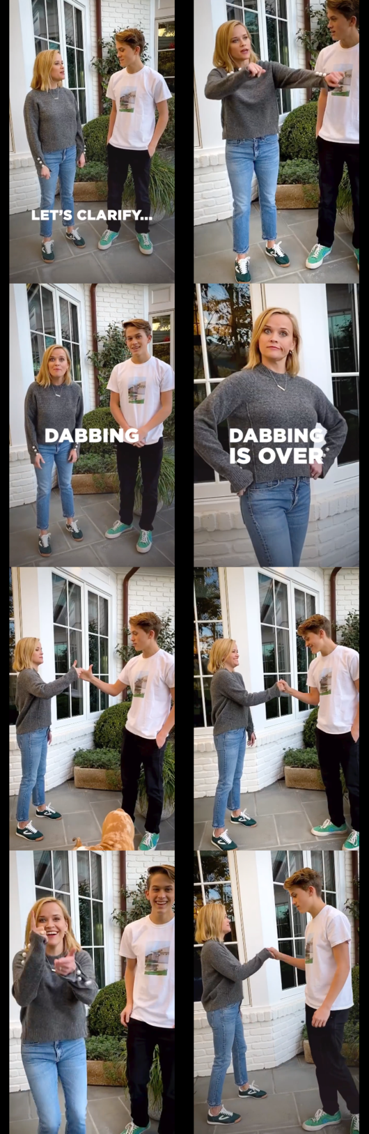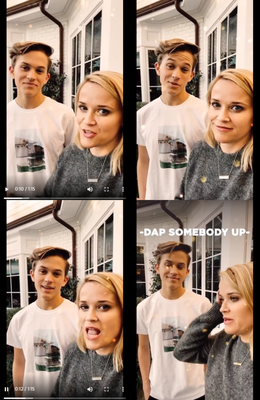 리즈 위더스푼은 24일(현지 시각) 자신의 인스타그램에 아들과 함께 있는 영상을 올렸다. 영상에서 그는 아들 디콘 필립에게 ‘힙’한 인사법을 배우고 있다. 스웨그 넘치는 스킨십이 눈길을 끈다.