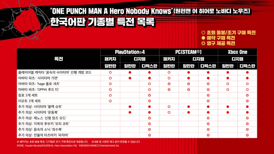 [smartPC사랑=임병선 기자] 반다이남코 엔터테인먼트 코리아(대표: 제랄드 누난)는 대전 액션 게임 'ONE PUNCH MAN A Hero Nobody Knows(원펀맨 어 히어로 노바디 노우즈)'의 PlayStation4(PS4), Xbox One(디지털, XB1) 버전이 2020년 2월 27일 발매되었다고 밝혔다.
