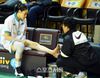 하나은행 강이슬이 경기 도중 발목부상을 입은 후 치료를 받고 있다.