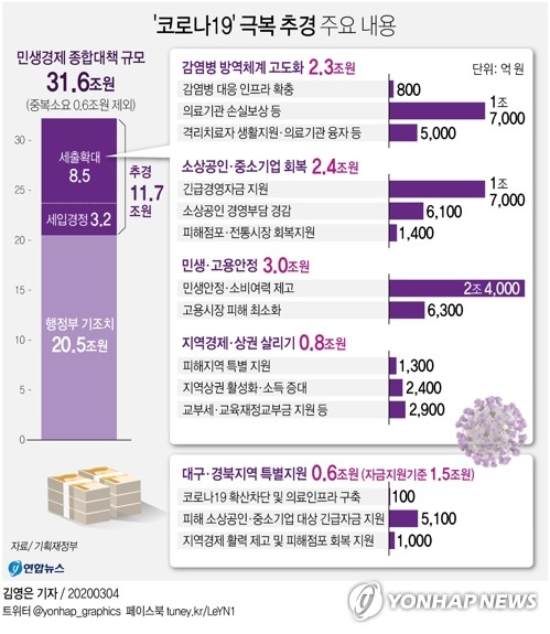 (세종=연합뉴스) 이 율 기자 = 정부가 신종 코로나바이러스 감염증(코로나19) 극복을 위해 11조7천억원 규모의 추가경정예산(추경)안을 편성했다.