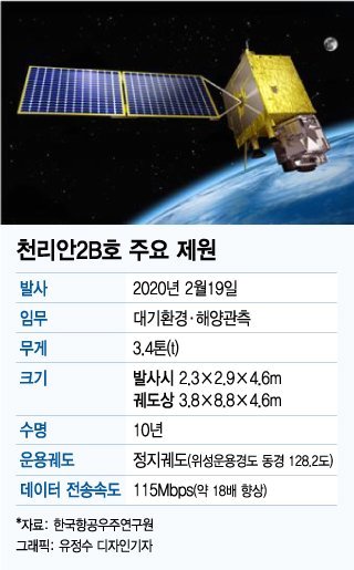 ‘천리안 2B’는 우리 독자기술로 개발한 세계 최초의 환경감시 정지궤도위성이다. 지난달 19일 남미 프랑스령 기아나우주센터에서 발사에 성공해 지난 6일 오후 7시 30분쯤(한국시각) 목표 정지궤도(고도 35,786km, 경도 128.25°)에 무사히 안착했다.