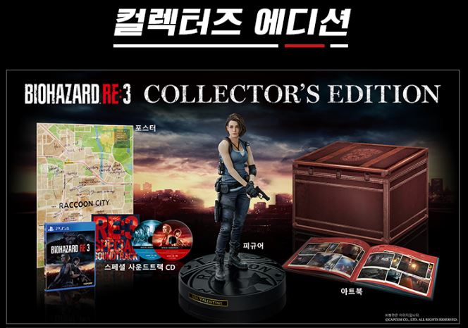 PS4 / XB1 '바이오하자드 RE:3' 패키지 제품의 예약판매는 일반판과 한정판에 해당하는 바이오하자드 RE:3 컬렉터즈 에디션으로 각각 나누어 진행될 예정이다. 예약구매 특전, 초회한정특전 및 한정판 구성품에 대한 상세 정보는 아래에서 확인할 수 있다.
