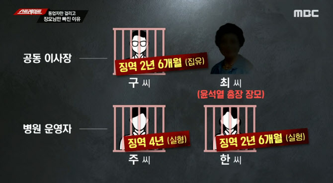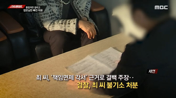 MBC 시사프로그램 스트레이트는 9일 저녁 방송에서 최모씨가 석연찮은 이유로 법망을 피해 간 사례들을 집중 조명했다. 이 가운데는 최씨가 공동이사장으로 있던 한 요양병원이 요양급여 불법수급 혐의로 기소된 사건에서 혼자 불기소 처분을 받은 사건도 포함됐다.