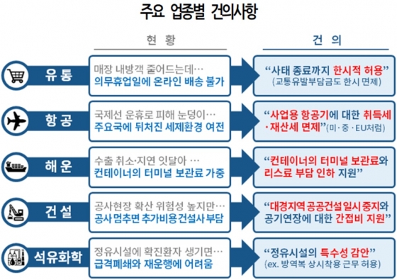 국제선 운휴 등에 따른 상반기 매출 피해가 5조원을 넘을 것으로 예상되는 항공업계에서는 미·중·EU(유럽연합)처럼 사업용 항공기에 대해 취득세·재산세를 면제해달라는 건의가 빗발친다. 해운업계는 해외의 입국규제 강화로 수출 취소·지연이 잇따르는 해운업계에서도 항만임대료 인하를 요청했다.
