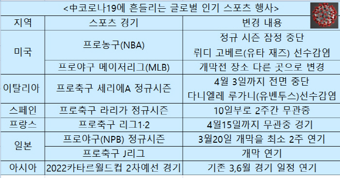 '미국프로농구(NBA)의 에펠탑'으로 불리는 스타 수비수 뤼디 고베르 선수(유타 재즈·27)와 이탈리아 세리에A 축구 선수 다니엘레 루가니(유벤투스·25)가 줄줄이 중국발 코로나바이러스(COVID-19·코로나19)에 감염됐다. 코로나19가 아시아를 넘어 미국·유럽 등으로 빠르게 확산되는 와중에 '무증상 감염·지역사회 확산' 양상을 보이면서 글로벌 인기 스포츠 경기도 속속 취소되고 있다.