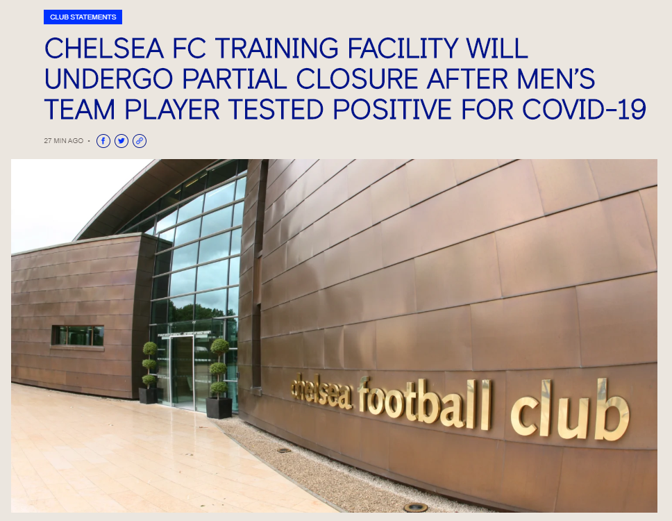 첼시는 13일(이하 한국시간) 공식 홈페이지를 통해 "소속 선수가 코로나19 양성 반응을 보임에 따라 훈련장 시설을 부분적으로 폐쇄한다"고 발표했다.