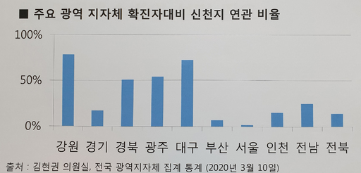 그 외 지역의 확진자 대비 신천지 연관 비율은 경남 36%, 전남 25%, 경기 18%, 충북 17%, 인천 15%, 전북 14%, 부산 7%, 대전 6%, 서울 2%, 충남·제주 0%였다.