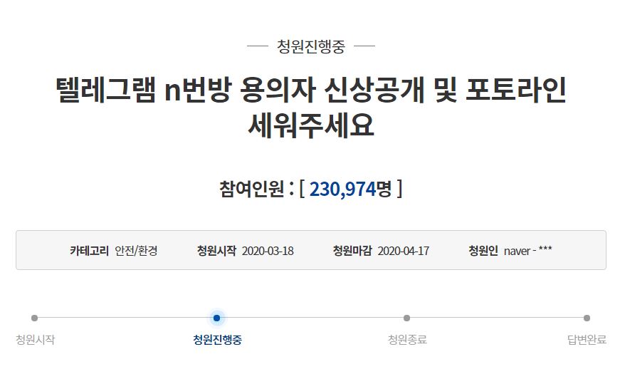 지난 18일 청와대 국민청원 게시판에는 '텔레그램 n번방 용의자 신상 공개 및 포토라인 세워주세요'라는 제목의 글이 올라왔다.