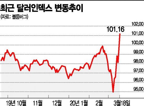 세계 주요 6개 통화 대비 달러 가치를 나타내는 달러 인덱스는 연일 상승세다. 최근 3년 사이 최고치다. 코로나19가 팬데믹(세계적 대유행)으로 이어지면서 전 세계 투자자들이 주식도, 채권도 던진 채 달러 현금만 확보하는 현상이 나타난 데 따라 세계적으로 달러 가뭄 현상이 나타나고 있는 것이다.