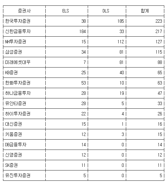 23일 금융투자업계에 따르면 한국투자증권 등 국내 16개 주요 증권사들이 국내외 주가지수나 개별종목 주가 또는 유가 하락으로 원금 손실 가능성이 생겼다고 홈페이지를 통해 투자자에게 공지한 ELS·DLS는 모두 1천77개로 집계됐다.
