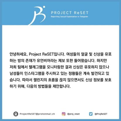 텔레그램 성 착취 신고 프로젝트 '리셋'은 22일 "현재 인스타그램에서 남성들이 악의적으로 해시태그를 서치하여 저희의 n번방 챌린지에 참여한 여성분들의 신상 정보를 수집한다는 제보가 들어왔다"며 "여성들의 얼굴 및 신상을 유포하는 방의 존재가 유언비어라는 제보 또한 들어왔지만, 저희 팀에서 텔레그램을 모니터링한 결과 신상은 유포하지 않으나 남성들이 인스타그램을 주시하고 있는 정황들은 계속 발견되고 있다"고 말했다.