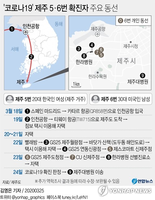 (제주=연합뉴스) 고성식 기자 = 제주 신종 코로나바이러스 감염증(코로나19) 5번째와 6번째 확진자는 정부 특별입국 절차 시행 직전 국내 입국해 관리 대상에 포함되지 않았던 것으로 나타났다.