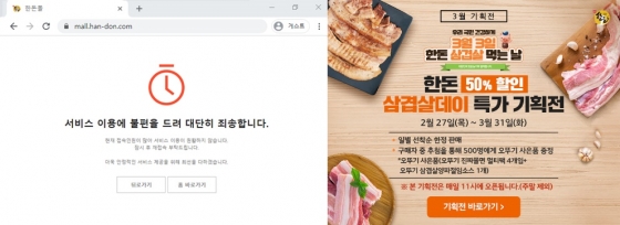 한돈협회에 따르면 한돈몰 3월 일일 매출은 평소대비 3.8% 늘었고 방문자수는 10배 이상 급증했다. 25일 오전 11시에도 구매를 위한 이용자들이 몰리며 사이트가 다운됐다. 한돈협회 관계자는 "접속자가 몰려 서버가 불안정한 아중에도 기획전을 통해 매출이 144% 늘었다"고 말했다.