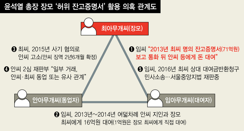 윤석열 검찰총장의 장모 최아무개(74)씨가 허위 잔고증명서를 부동산 경매 과정뿐만 아니라 사인에게 돈을 빌리는 데도 활용한 것 아니냐는 의혹이 일고 있다. 최씨 명의로 발급된 허위 잔고증명서를 보고 돈을 빌려줬다는 임아무개씨는 “최씨와 직접 통화까지 했다”고 주장하며, 최씨를 상대로 민사소송을 건 상태다. 그러나 최씨는 동업자인 안아무개(60)씨와 대여자 임씨 사이의 거래일 뿐이고 통화한 사실도 없다고 부인한다. 최씨의 사문서위조 의혹 등을 수사하는 의정부지검은 곧 최씨에게 사문서위조 혐의 등을 적용해 기소할 방침인 것으로 알려졌다.