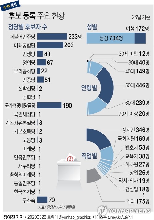 (서울=연합뉴스) 류미나 기자 = 21대 총선 후보등록 첫날인 26일 후보자의 36.5%가 전과를 보유한 것으로 집계됐다.
