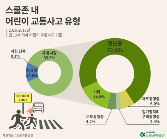 도로교통공단 자료에서도 2016년~2018년 스쿨존내 차대사람 사고에서 △보행자 보호의무 위반 41%, △운전자 안전운전 의무 불이행 23%, △ 신호위반 17% △기타 운전자 법규 위반 12.8% 로 집계됐다. 결국 스쿨존 어린이 인사사고에서 명확한 신호위반이나 법규위반이 아니더라도 '보행자 보호의무 위반'이나 '운전자 안전운전의무 불이행'이라는 명목으로 64%가 처리되고 있단 것이다.
