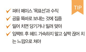 손목으로 딱 때려 치거나 갑자기 멈추는 것이 아닙니다. ‘가속’을 멈추는 겁니다. “퍼트를 할 때 볼을 밀어 치면 경사를 잘 타지 않고 그대로 밀려나가는 경우가 많다. ‘툭’ 하고 끊어 치는 느낌의 스트로크란 백스윙보다 폴로스루를 짧게 가져가는 느낌으로 미는 느낌과 때리는 느낌의 중간 정도로 생각하면 쉽다. 퍼팅 연습을 해보면 살짝 감이 오게 된다”는 설명입니다.